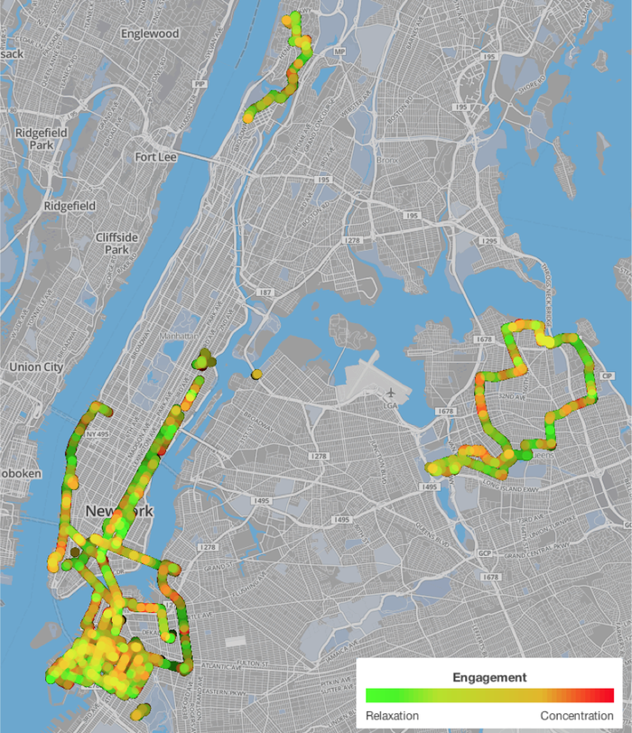 Originally developed at MIT, MindRider is a helmet that shows you how your rides engage your mind, and an app that maps this experience as you ride. In the past year, our team has built a set of MindRider helmets powered by brain-computer interfaces (BCI), which MindRider cyclists have been using to map their mental engagement as they ride through New York City. Using the MindRider app, our team is now formally mapping Manhattan! In December, we will publish a citywide dataset+guidebook+poster that we can all use. Imagine: a map of Manhattan's mental signature!