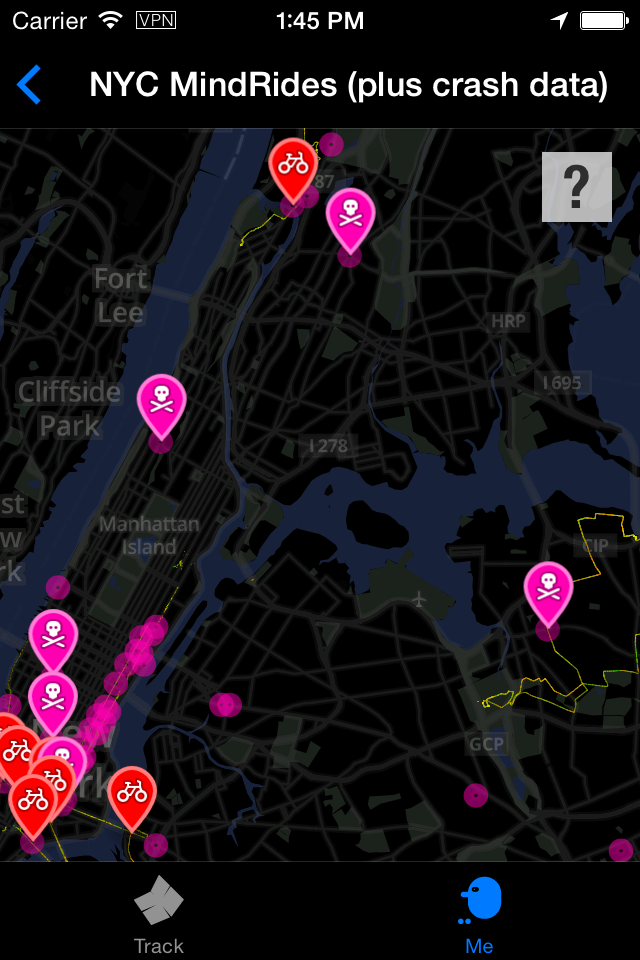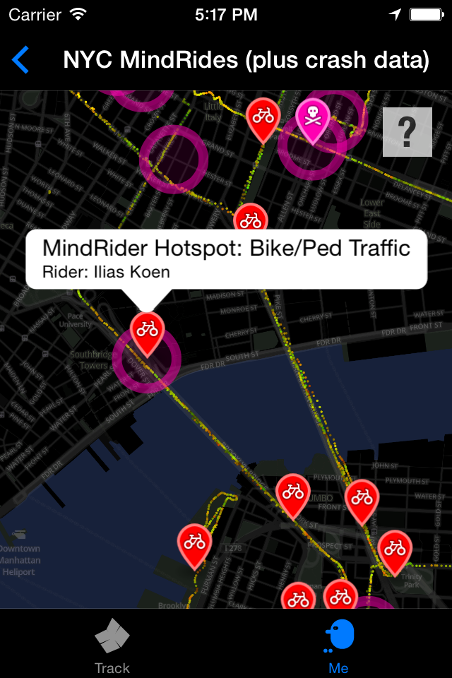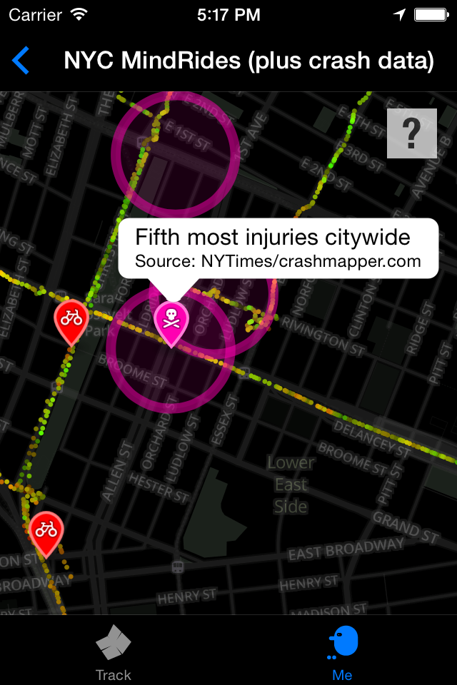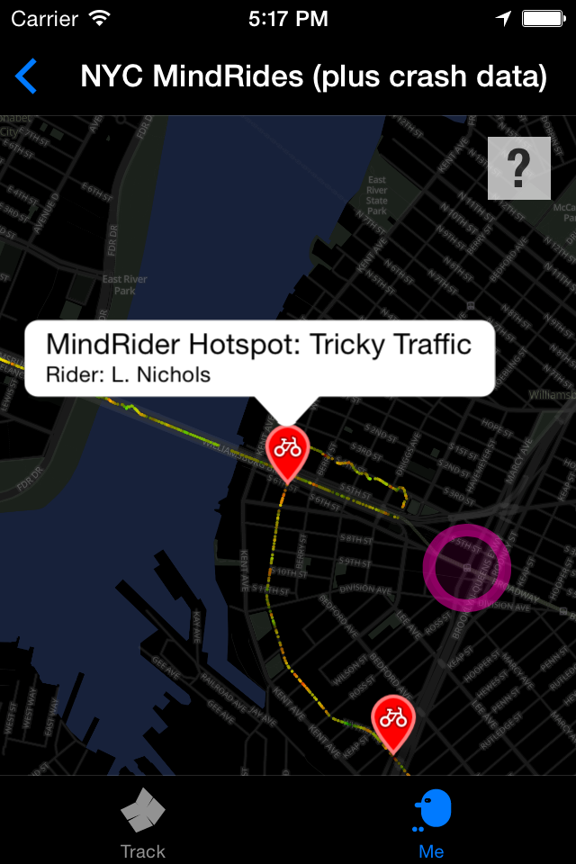 ABOUT THIS SUBMISSION: The app we're submitting to the Connected Intersections Challenge is the same app we're using to formally map NYC throughout September-October 2014. The MindRider app is mainly used for tracking riders, but it also shows an "NYC MindRides" map of all our rides from this past spring/summer. This NYC MindRides map also shows top accident areas in NYC-- check it out to see patterns between MindRider's "Hotspots" (areas of high mental concentration) and NYC's accident-prone areas.